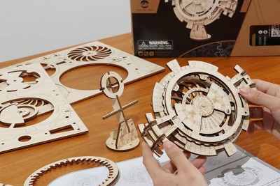 Le puzzle 3D en bois Planétaire musical est une réplique du mécanisme rétro Orrery. Il s'inspire de cette maquette du système solaire qui illustre les positions et les mouvements relatifs des planètes et des lunes. Les planètes sont faites d'acrylique coloré et de cercles. Pendant que les planètes suivent chacune leur trajectoire une douce mélodie est jouée par cette sublime mécanique.