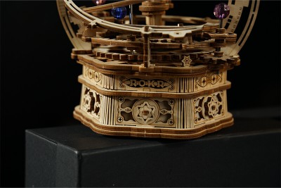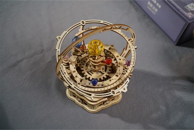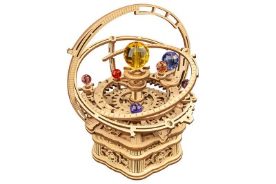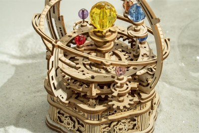 Le puzzle 3D en bois Planétaire musical est une réplique du mécanisme rétro Orrery. Il s'inspire de cette maquette du système solaire qui illustre les positions et les mouvements relatifs des planètes et des lunes. Les planètes sont faites d'acrylique coloré et de cercles. Pendant que les planètes suivent chacune leur trajectoire une douce mélodie est jouée par cette sublime mécanique.