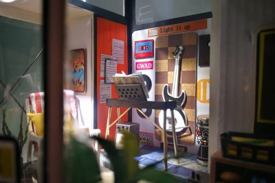 Kevin's Studio est une miniature de studio de musique de style moderne que vous pouvez construire avec amour. Un bureau de production de musique vivante avec un équipement audio comme une guitare, des lecteurs CD et des lecteurs stéréo, une basse, des haut-parleurs, un clavier électronique et un tambour africain.
